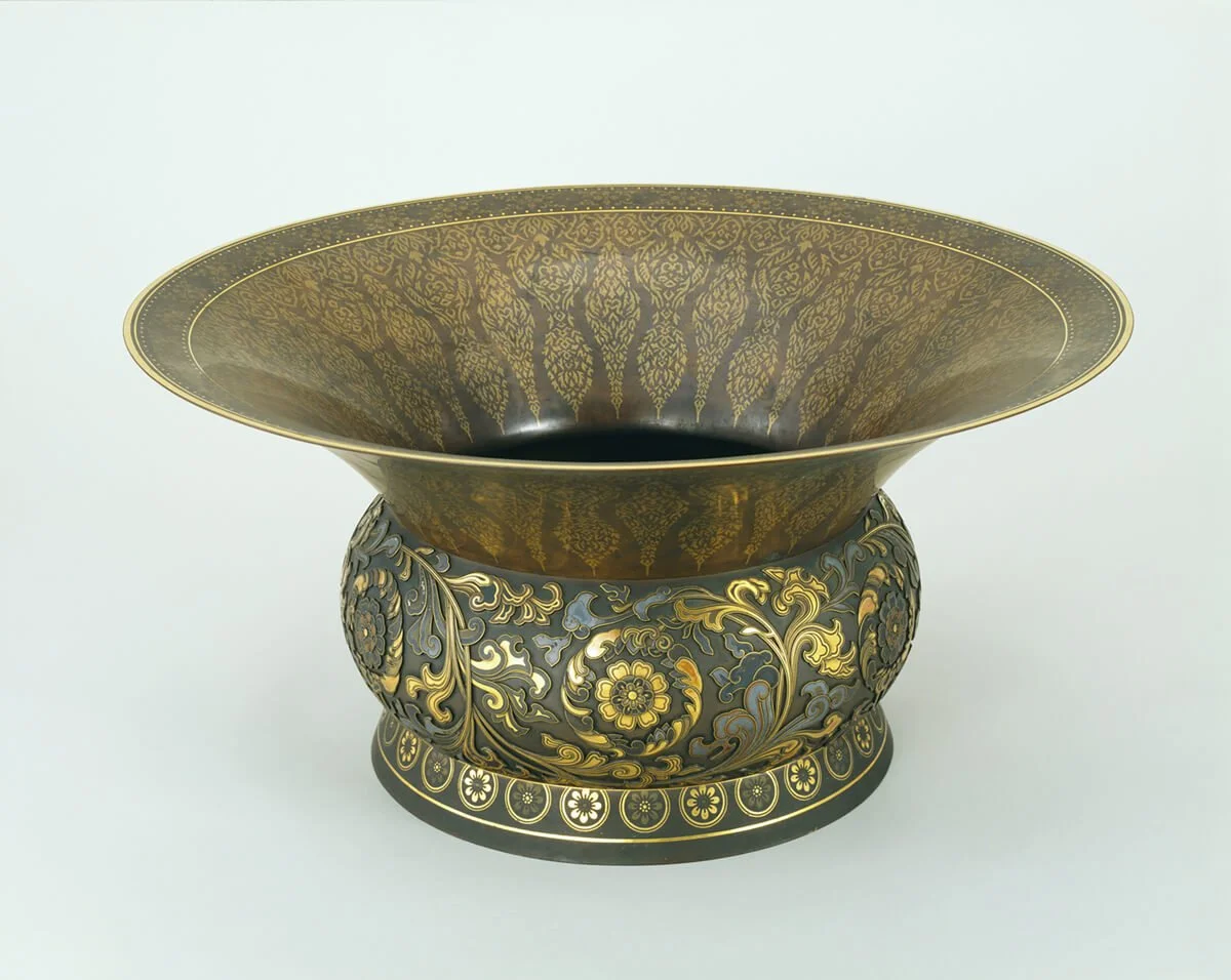 Crafted in 1891 by Kanazawa Doki Gaisha Co., this vase is a mesmerizing dance of contrasts — the vessel's rim is delicately inlaid with hairline patterns that evoke the tactile quality of fine fabric, while its body boasts a bold arabesque pattern adorned with opulent displays of gold and silver inlay. Image courtesy of Sannomaru Shozokan.