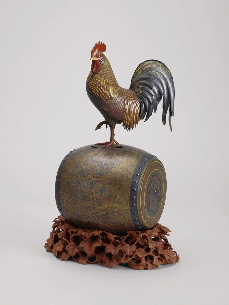 Crafted by Yamao Jikichi (1862-1923) in 1900, this exquisite incense burner depicts a rooster perched atop a kanko dum. Image courtesy of Sannomaru Shozokan.