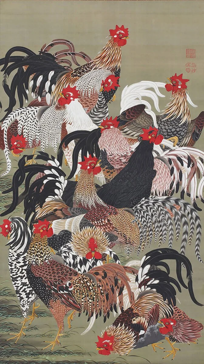 Listed as National Treasure, Ito Jakuchu’s Flora and Fauna - Painting of Flock of Chickens presents a lively gathering of roosters competing for attention. Image courtesy of Sannomaru Shozokan.