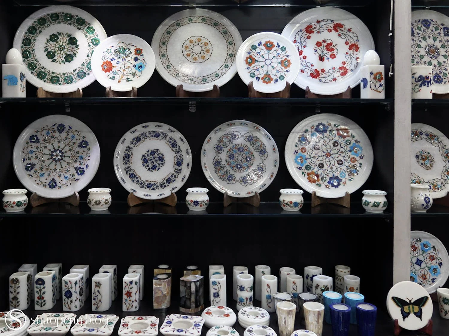 The assortment of items adorned with stone inlay ranged from table tops, plates, bowls, and cups to jars, trays of various sizes, and boxes. It seemed as though this artistic tradition, once confined to architectural spaces, had found its way into the fabric of daily life, akin to its Italian counterpart.