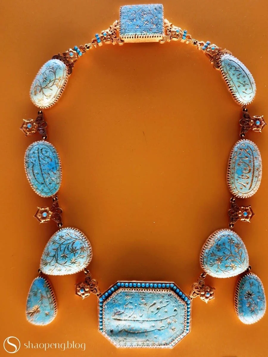 Dated to 19th-century Iran, this turquoise necklace bears an inscription of a Persian poem, blending artistry with literary elegance.