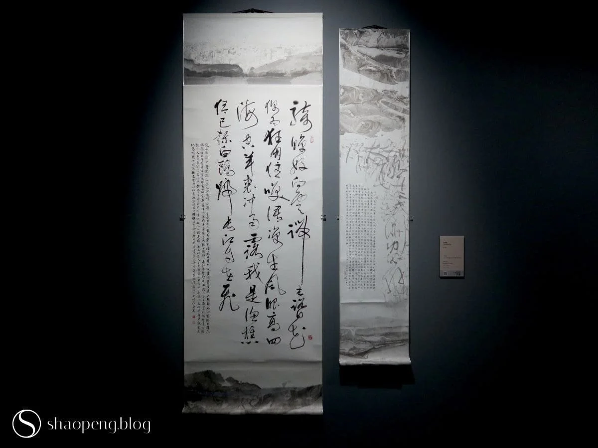 Among the many works on view, I’m particularly drawn to the work by Lee Shew-Hua (李秀華). In Suite of Flowing Ink and Calligraphy Writing, Lee’s proficiency across a wide spectrum of scripts is evident. However, it’s the atmospheric ink washes at the top and bottom of her hanging scrolls that catch me off guard. Soft, cloud-like, and meditative, these misty landscapes bear a resemblance to ebru, the marbled art believed to have originated in Central Asia.