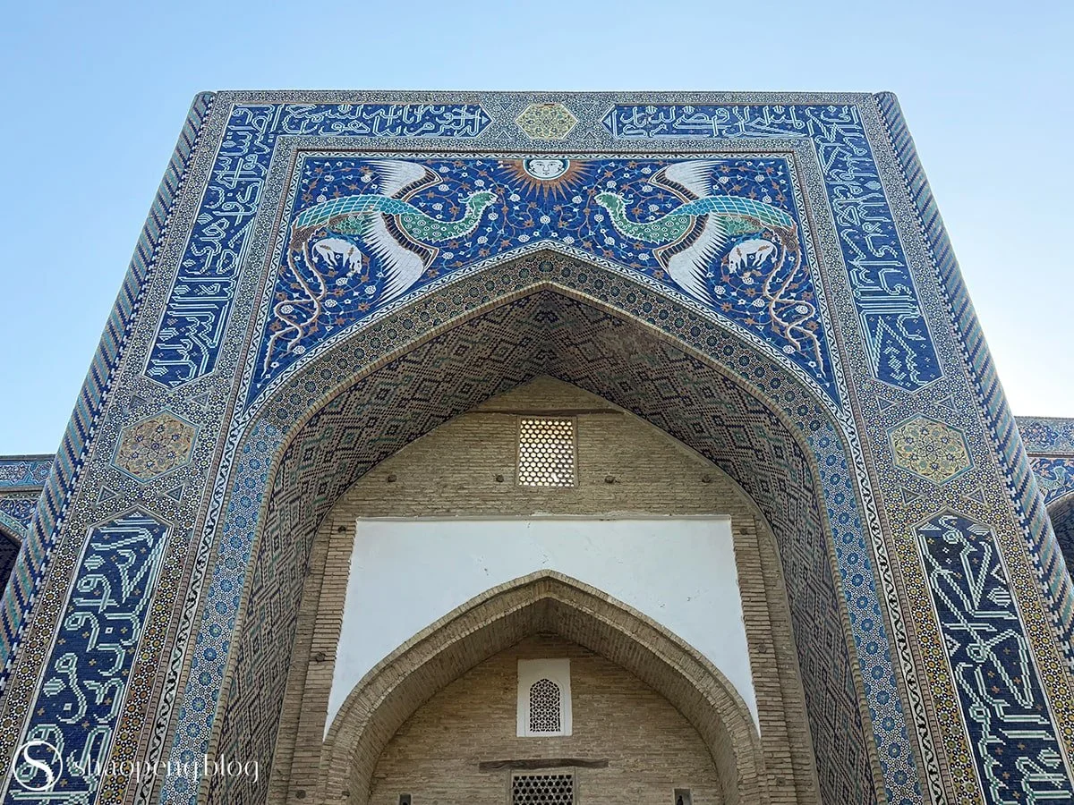 A pair of huma birds hovers between myth and reality on the portal of Nadir Divanbegi Madrasa in Bukhara.