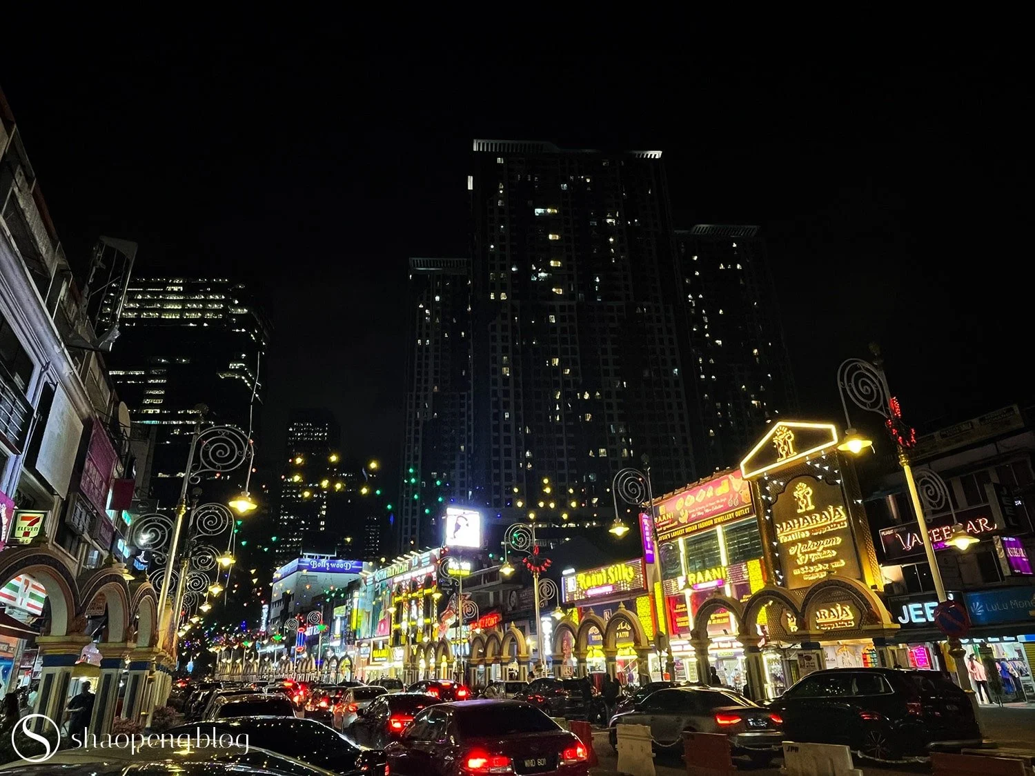 In Kuala Lumpur, Little India comes alive at night, buzzing with energy against the backdrop of the city's towering skyscrapers.