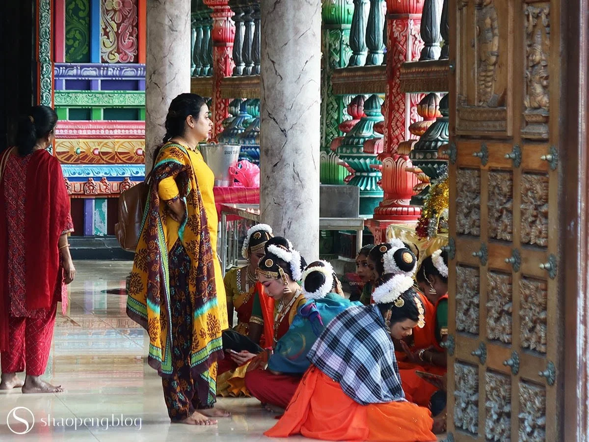 Inside one temple, a group of dancers rests, reminding us that classical Indian dance grew from devotion to deities. Devout worshippers move from deity to deity, performing pujas before each. Some press palms together in prayer for blessings and protection; others seek guidance, solace, and clarity.